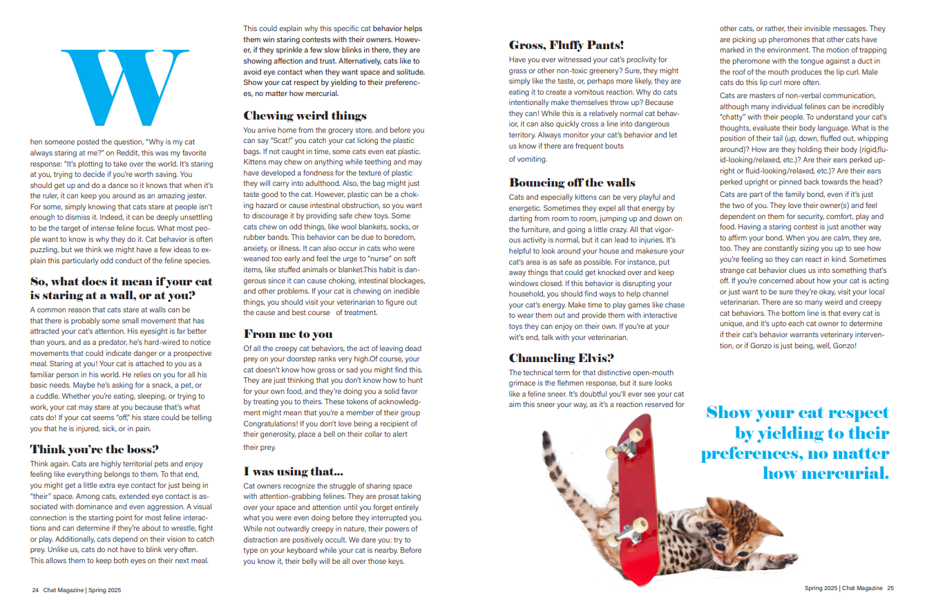 For this project, I was tasked with creating a magazine cover that represented the fictional Chat Magazine’s main story “Weird cat behavior explained,” along with its two other article titles. The second part of the project was to format the main story and create graphics that engaged readers with the content.