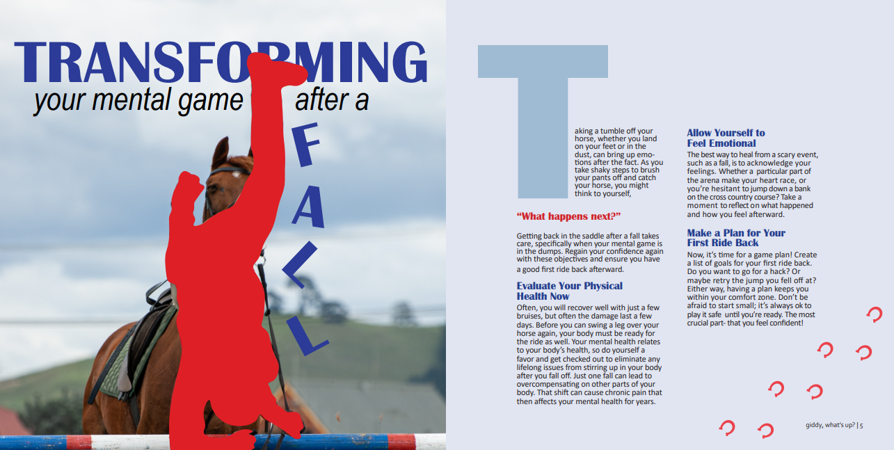 As an avid equestrian myself, I was so excited to create a mini magazine focused on equestrian lifestyle. giddy, what’s up? is 8X8 inches with 12 pages. In addition to designing the spreads, I also wrote every article myself. I covered a range of topics, including mental health, events and a discipline feature.