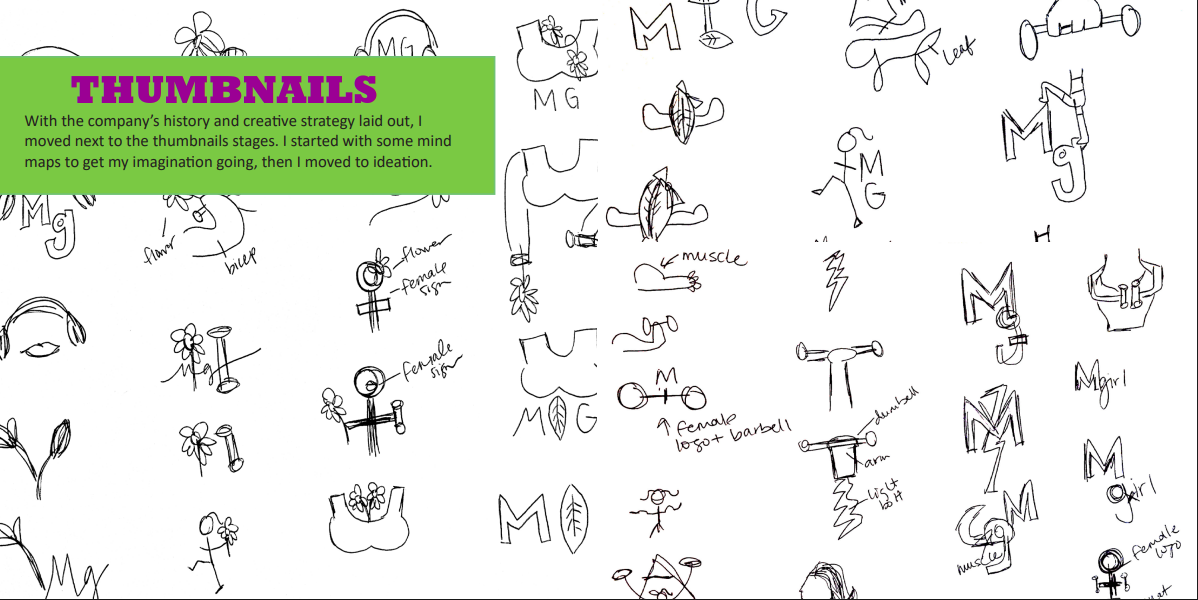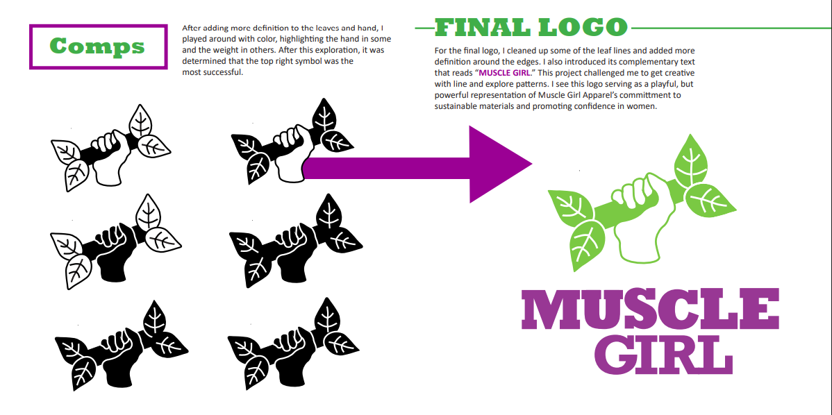Take a peek at the steps I took when creating a logo for the fictional Muscle Girl Apparel brand. From thumbnails to a finished logo ready for branding materials, I cover the full process in this booklet. I built on themes of strength and sustainability to create the Muscle Girl logo seen above.